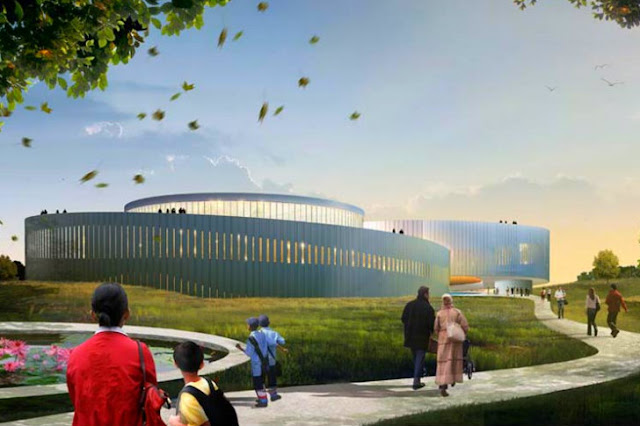 While the 2012 Olympic Games are taking place in London, construction of a new green-roofed Olympic museum in Tianjin, China is also underway. Dedicated to former International Olympic Committee (IOC) chairman Juan Antonio Samaranch, the new Samaranch Memorial Museum will feature exhibits to commemorate his legacy as well as the influence of the Olympics in China. Dutch firm HAO and Beijing firm Archiland International designed the museum, which will be surrounded by a lush new park and will feature 5 Olympic-inspired rings, a rooftop photovoltaic system, and geothermal heating and cooling.